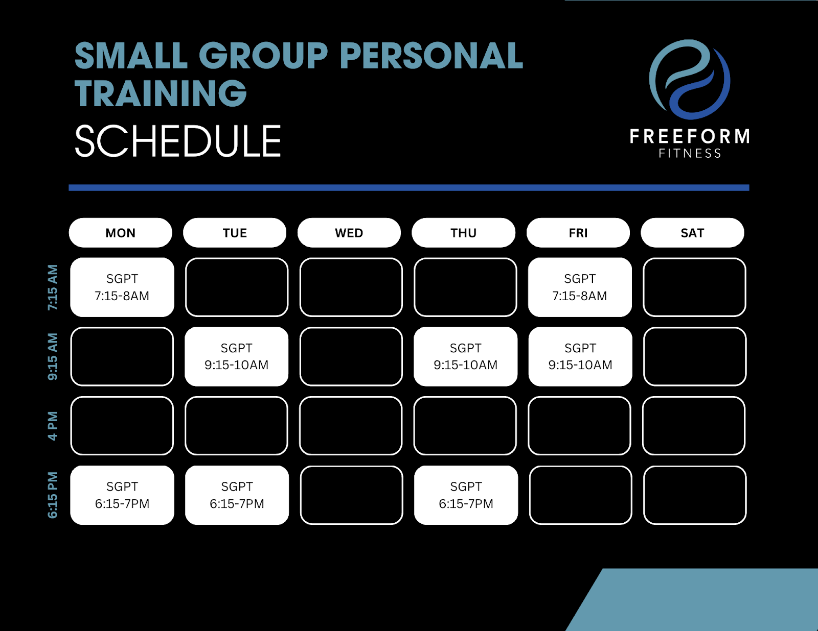 Our small group personal training offers individualized programming in a dynamic group environment (up to 6 people). Each client gets their own custom plan based on their assessment and goals, but trains alongside others for added motivation and support.